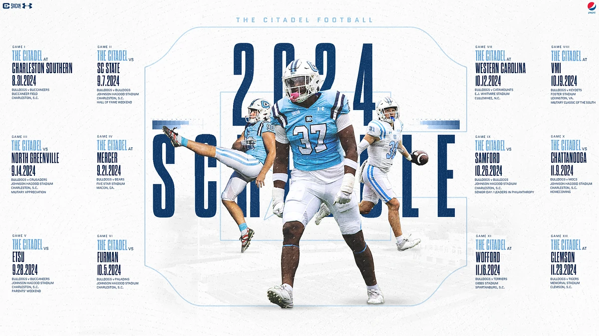 The Citadel football program released the program's 2024 schedule Monday afternoon, compiling a vigorous four-game non-conference lineup along with the usual eight-contest Southern Conference slate. The Bulldogs open the season against local rival Charleston Southern on Aug. 31 before shifting focus to SoCon competition on Sept. 21, heading south to battle Mercer in Macon, Ga.