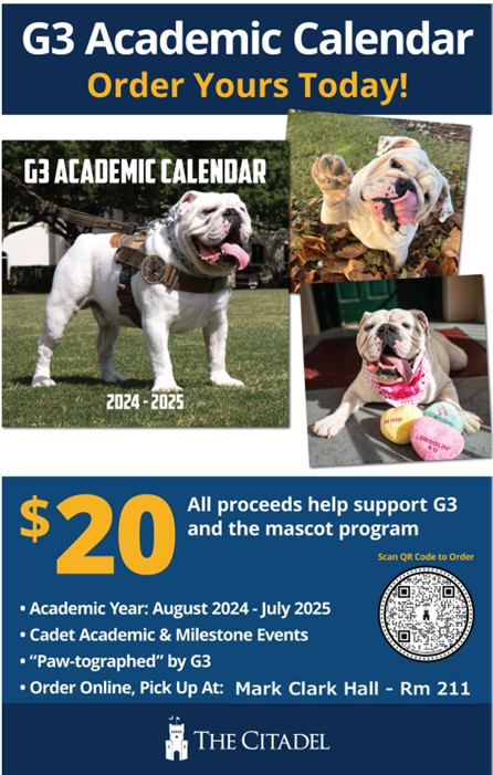 They’re Back! The 24-25 Academic Calendars starring The Citadel's own Gen. Mike Groshon (G3) will be arriving May 1st! All proceeds from this calendar go toward supporting G3's up-keep and cookie habit.